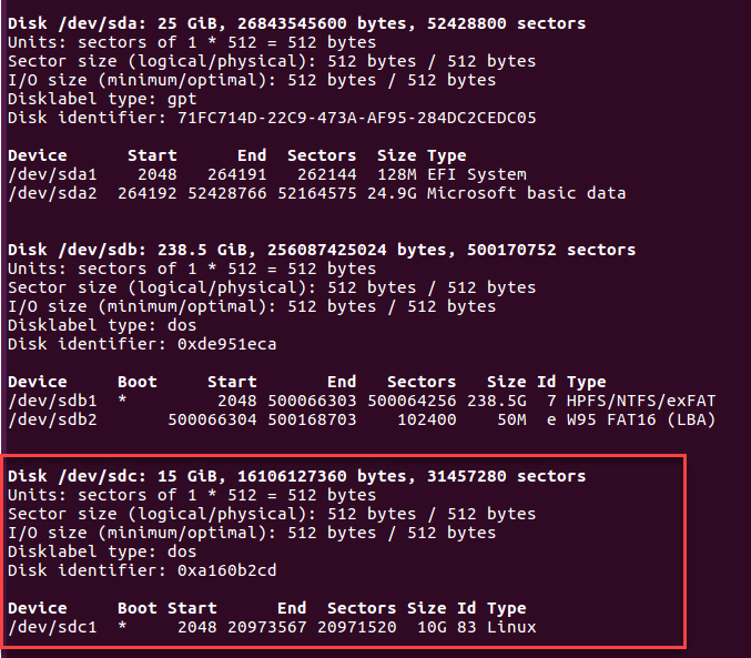 sda(윈도우하드), sdb(USB디스크), sdc(리눅스디스크)의 상태를 보자.